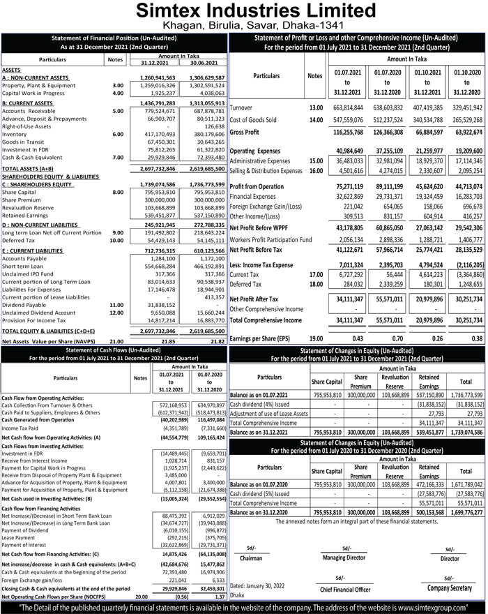 Q2 (Un-audited) Financial Statements of Simtex Industries Limited