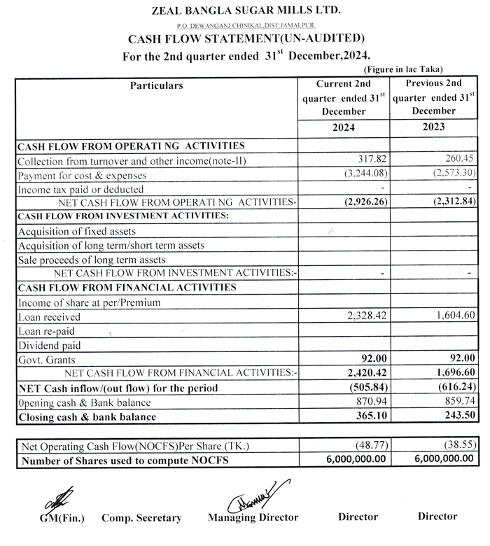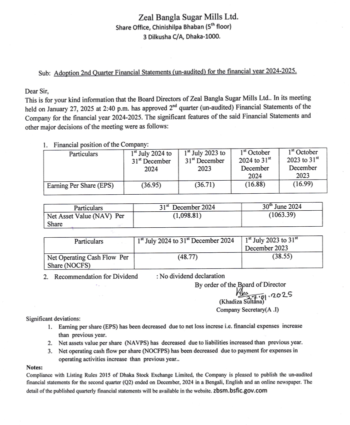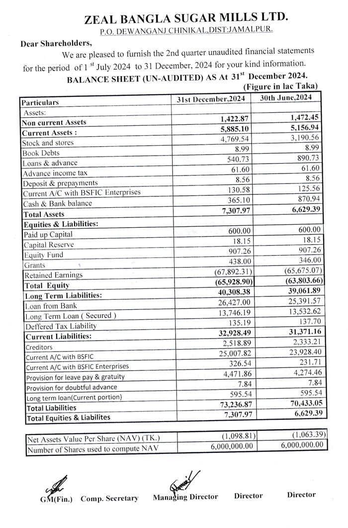 Q2 Un-audited Financial Statements of Zeal Bangla Sugar Mills Ltd.