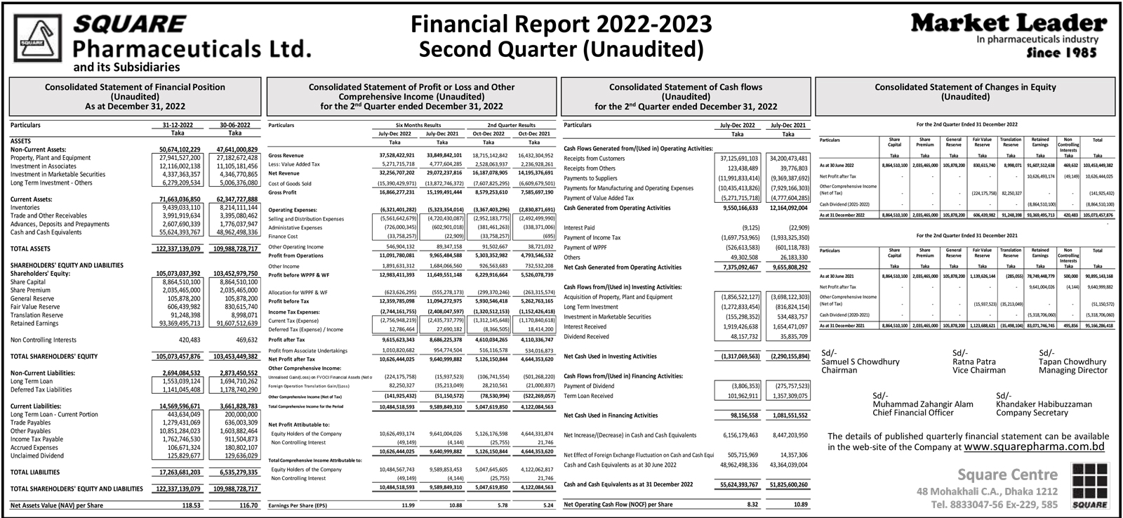 Q2 (Unaudited) Financial Statements of Square Pharmaceuticals Ltd