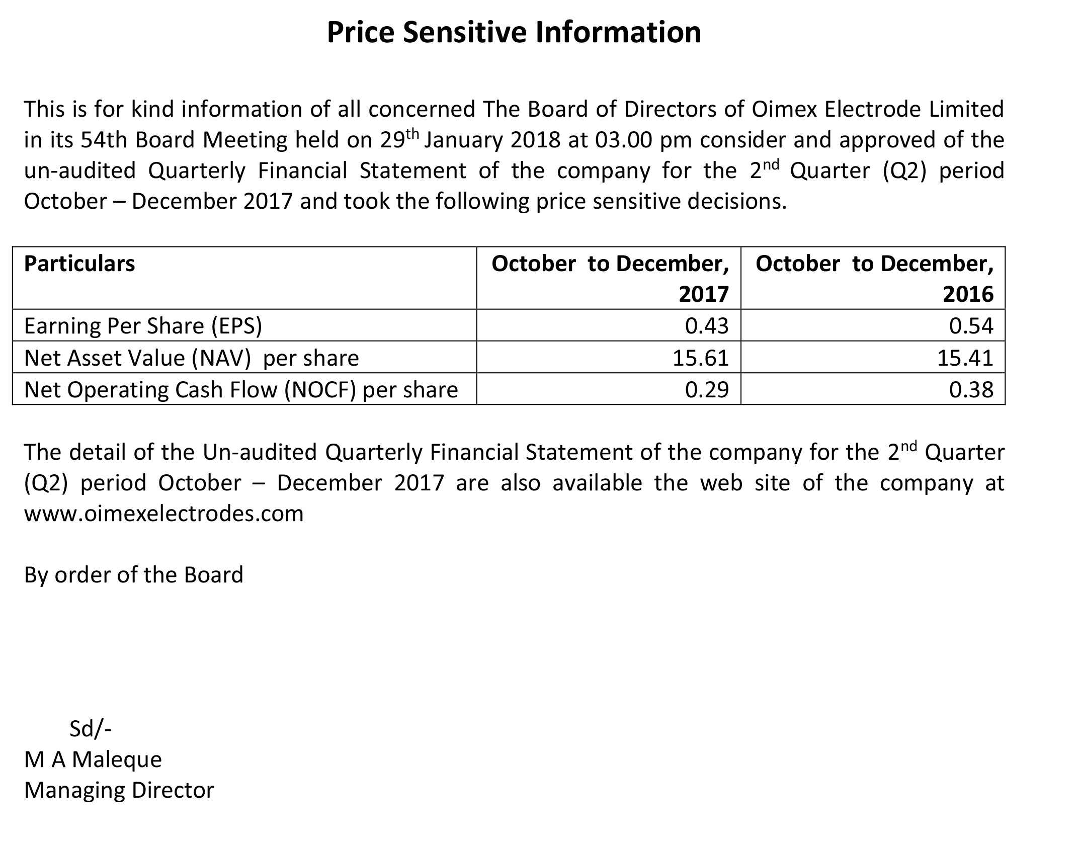 Q2 Financial Statements (Un-audited) of Oimex Electrode Limited