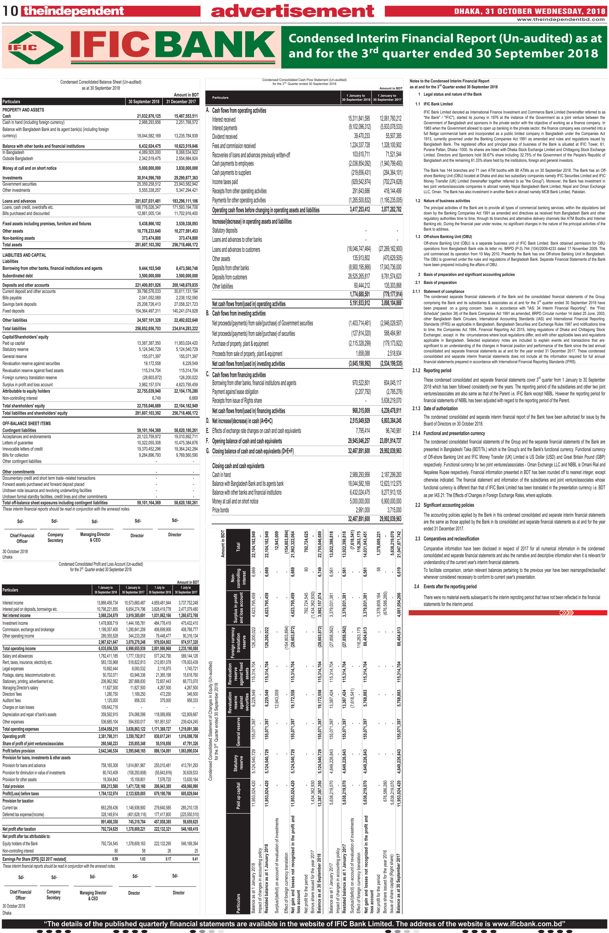 Q3 Financial Statements (Un-audited) of IFIC Bank