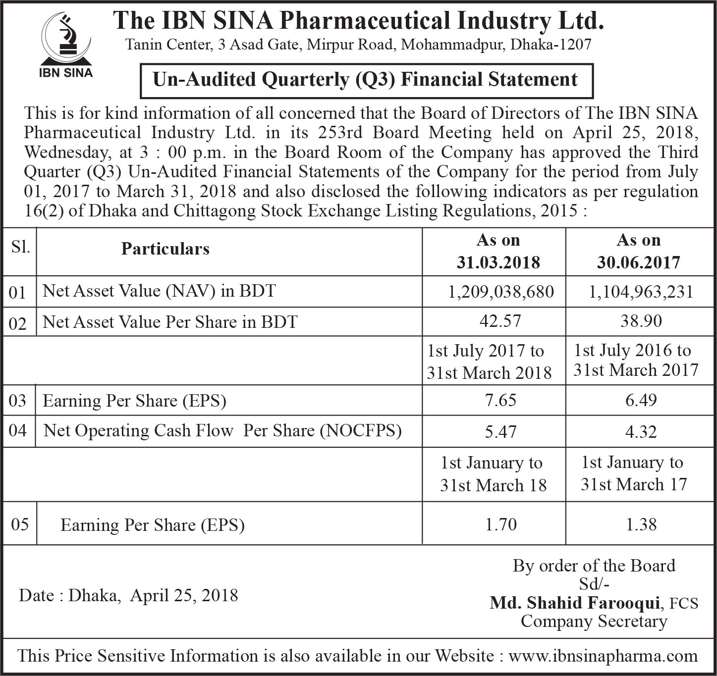 Price Sensitive Information (Q3) of IBN SINA Pharmaceutical Industry PLC.
