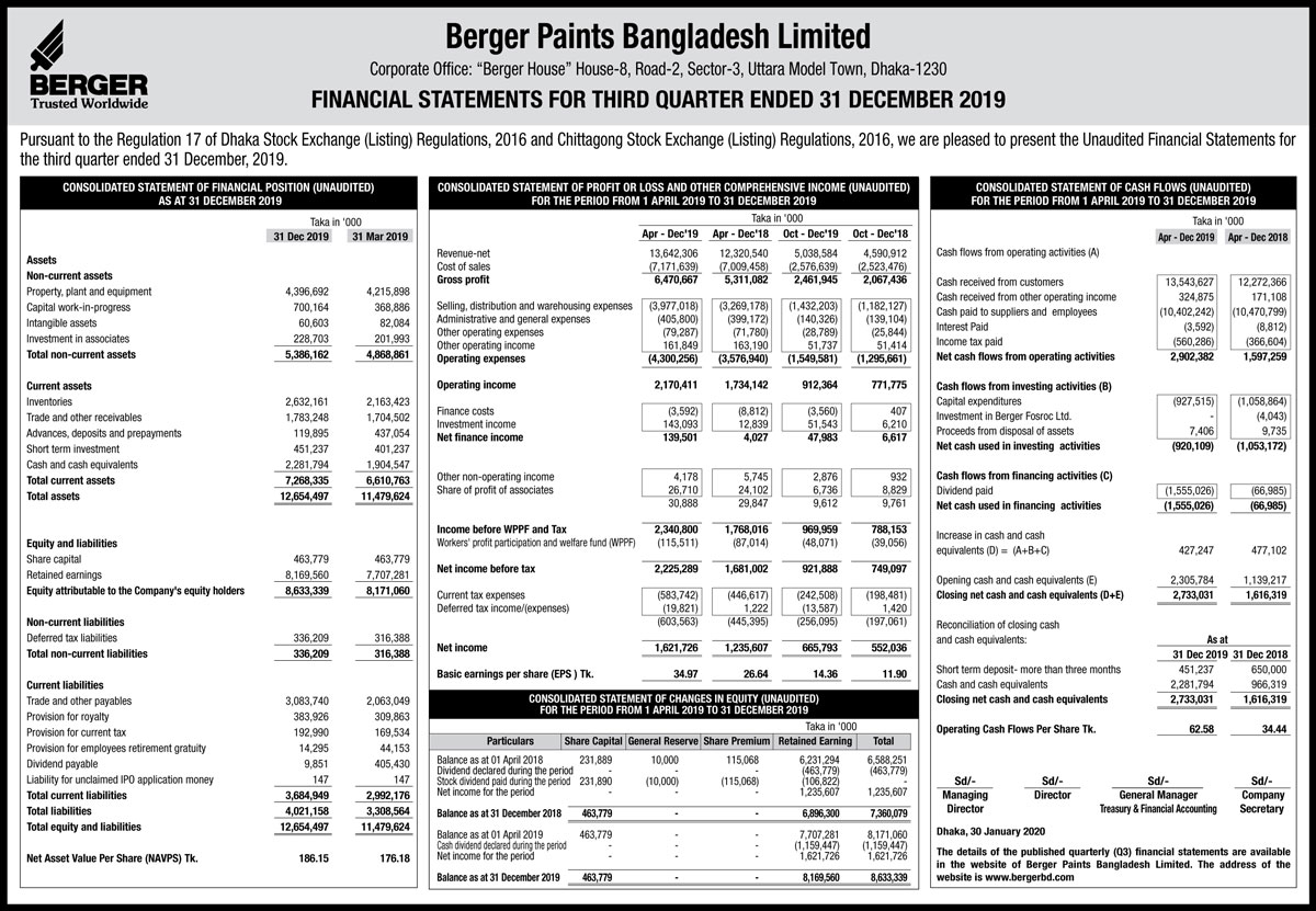 Q3 Financial Statements of Berger Paints Bangladesh Ltd