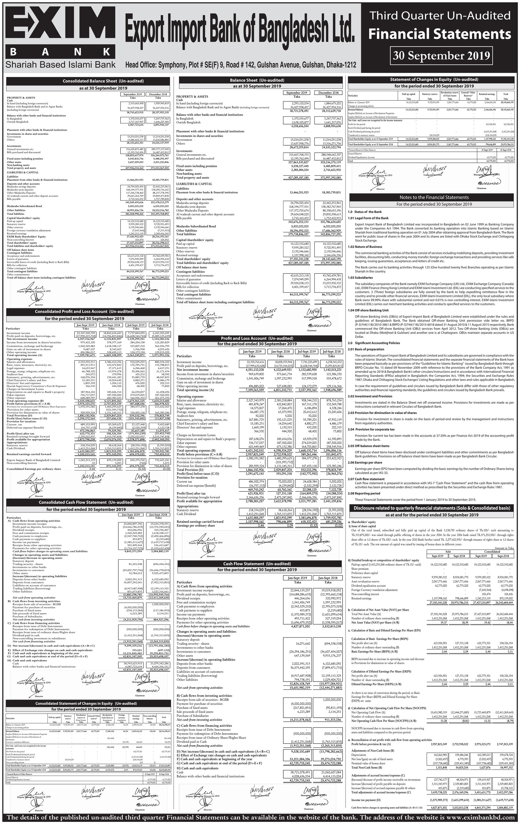Q3 Financial Statements (Un-audited) of EXIM Bank Ltd.