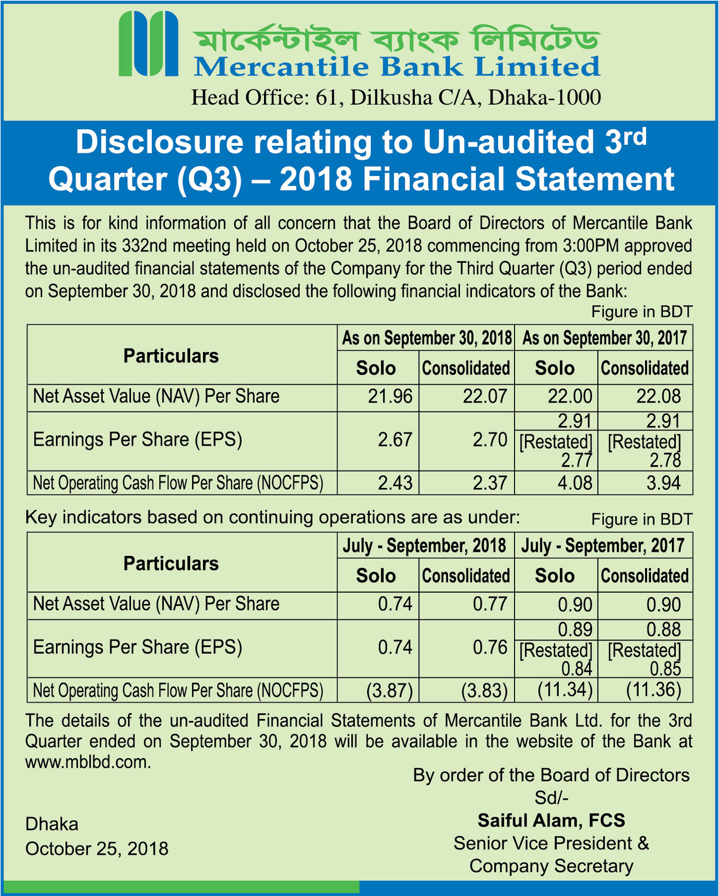 Q3 Un-audited Financial Statements of Mercantile Bank PLC.