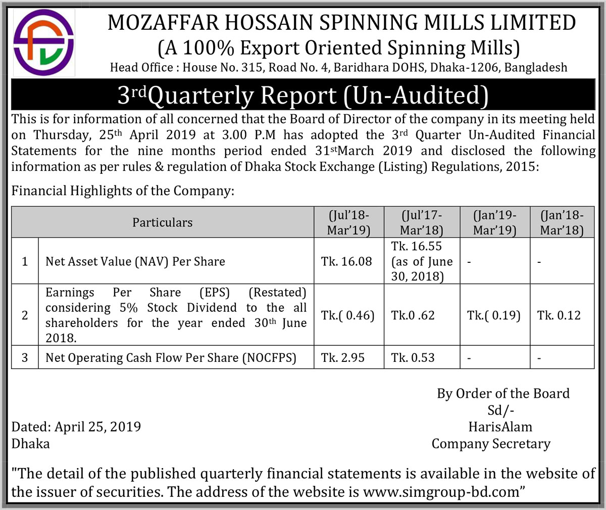 Q3 Financial Reports of Mozaffar Hossain Spinning Mills Ltd