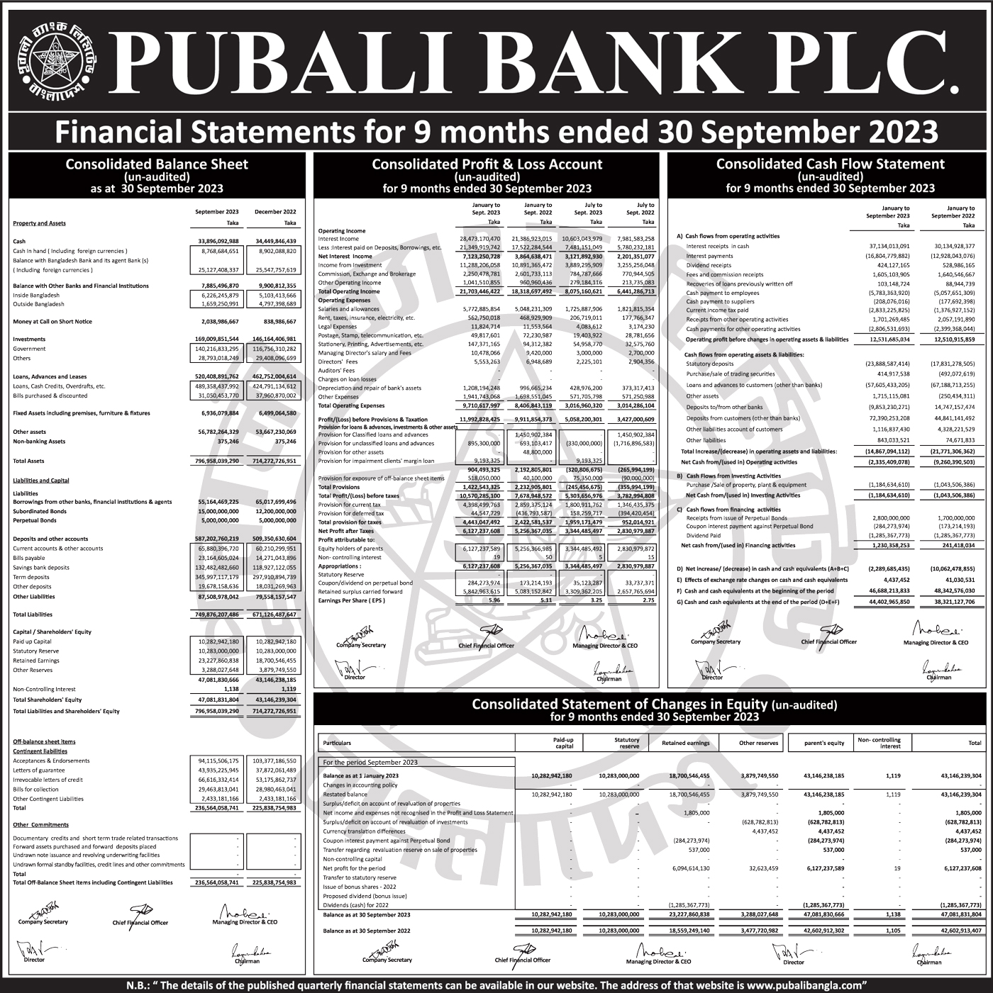 Q3 Financial Statements of Pubali Bank PLC