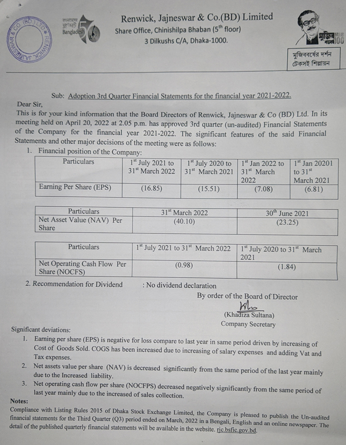 Q3 Financial Statements of Renwick Jajneswar & Co. (Bd) Limited