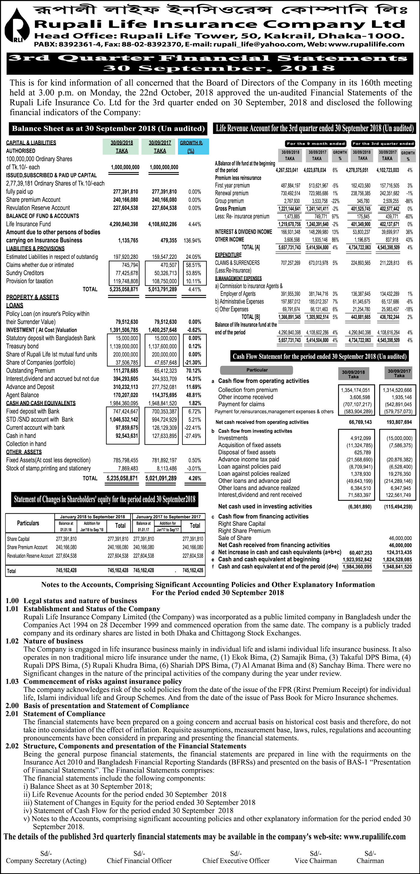 Rupali Life Insurance Company Ltd 3Q Financial Statements