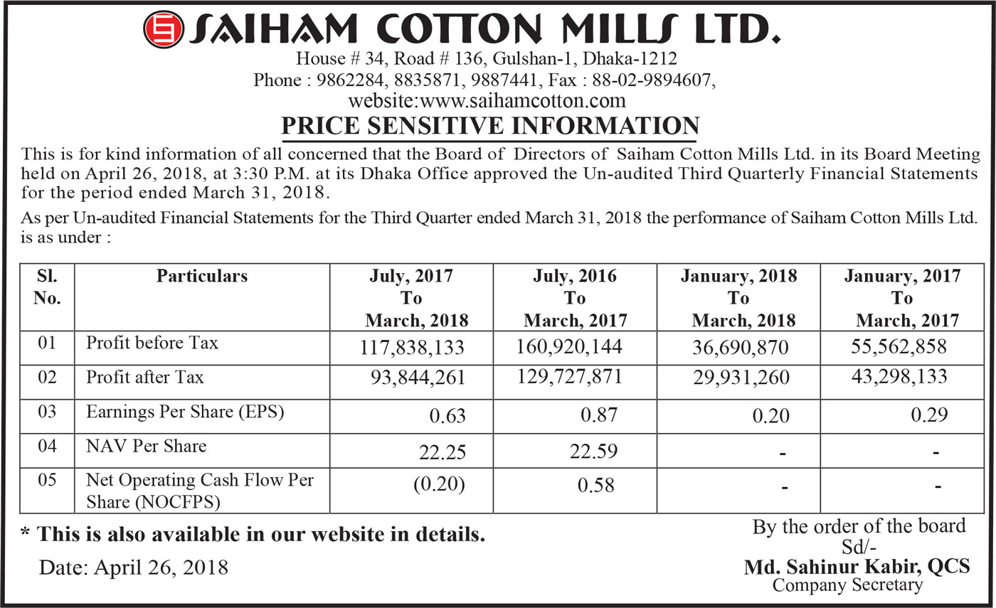 Price Sensitive Information of Saiham Cotton Mills Limited
