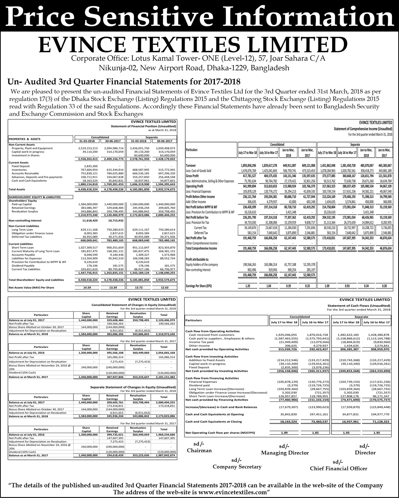 Q3 Financial Statements (Un-audited) of Evince Textiles Ltd