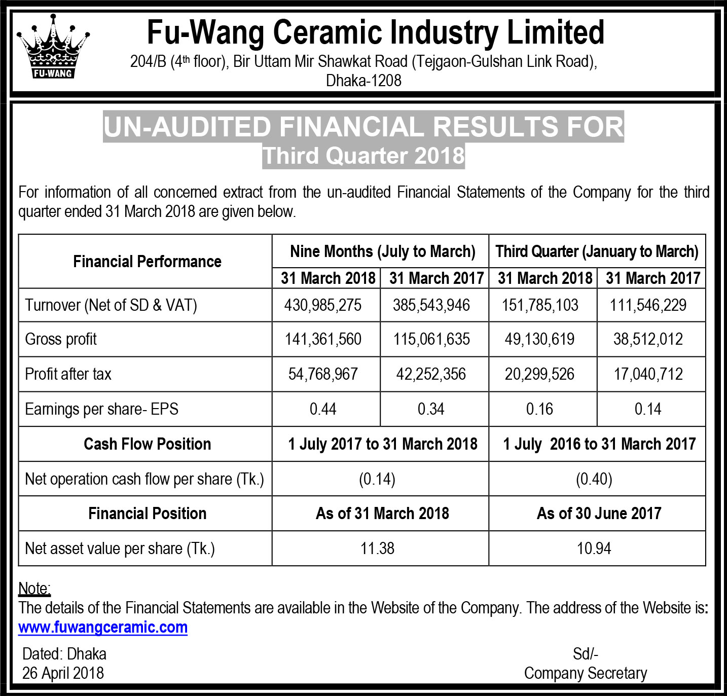Un-audited Financial Statements (Q3) of Fu-Wang Ceramic Industry Limited