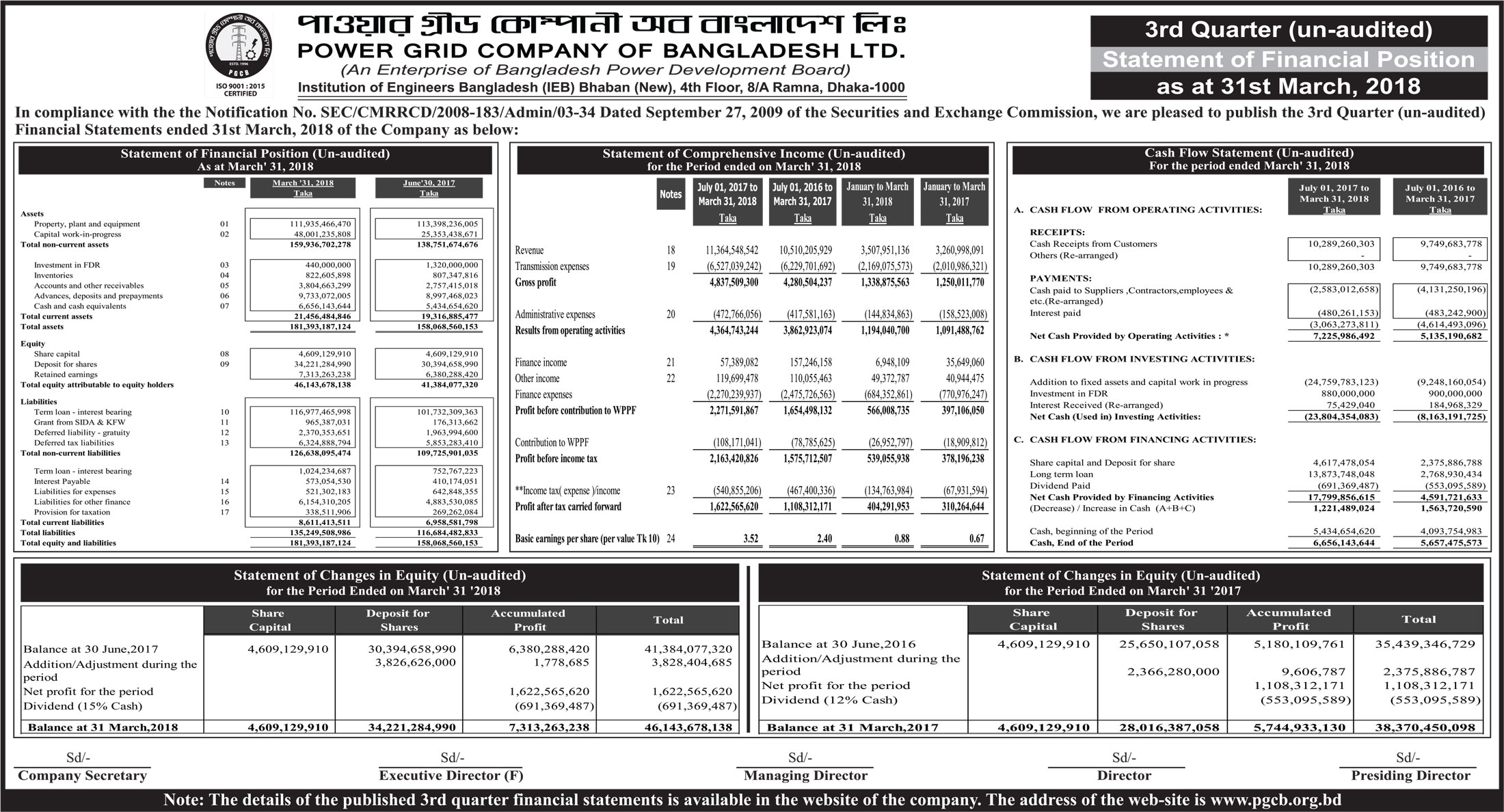Q3 Financial Statements (Un-audited) of Power Grid Company of Bangladesh Limited