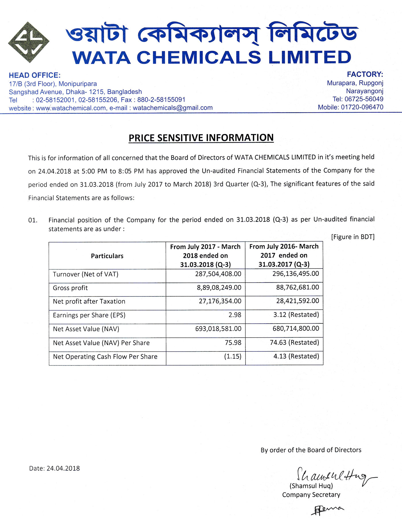 Notice of the 42nd AGM of Wata Chemicals Limited