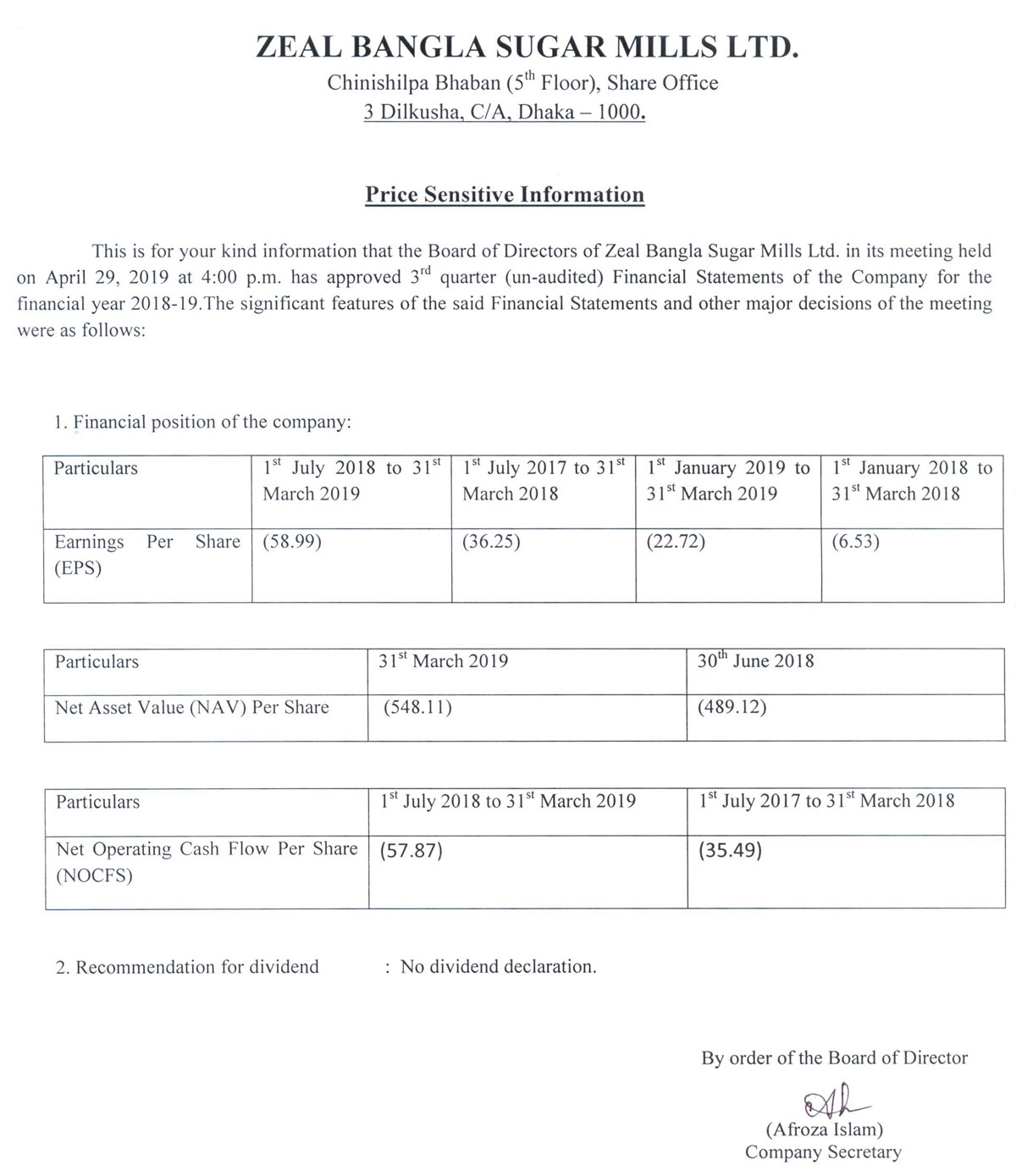 Q3 Financial Statements of Zeal Bangla Sugar Mills Ltd