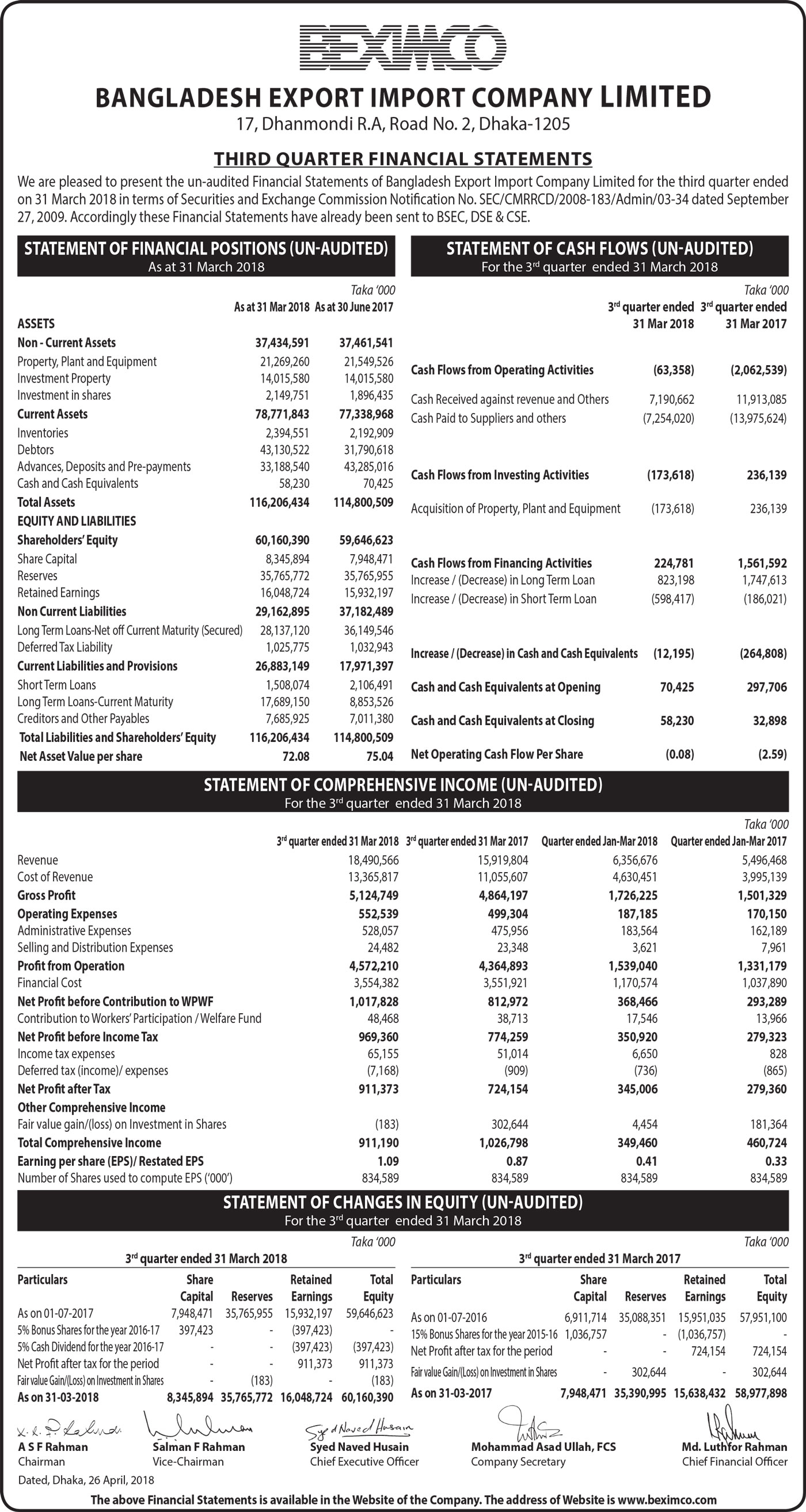 Q3 Financial Statements of Bangladesh Export Import Company Ltd (BEXIMCO)