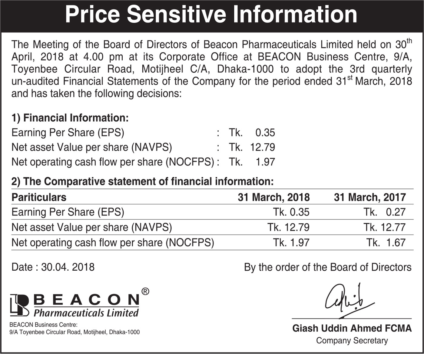 Price Sensitive Information of Beacon Pharmaceuticals PLC.