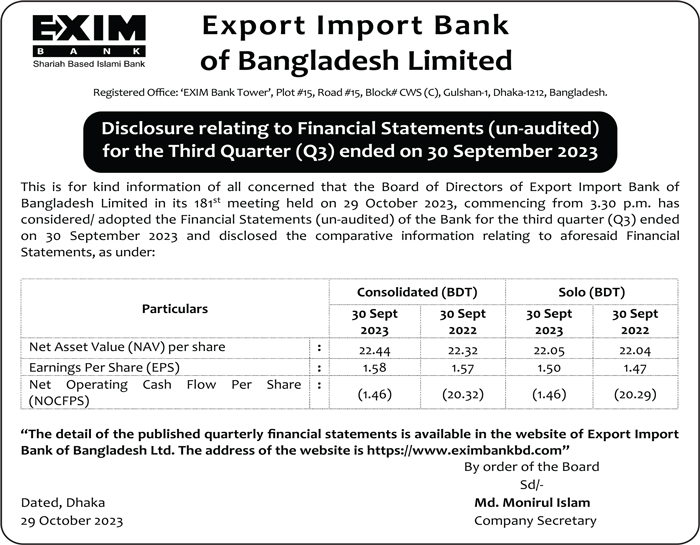 Q3 Un-audited Financial Statements of EXIM Bank