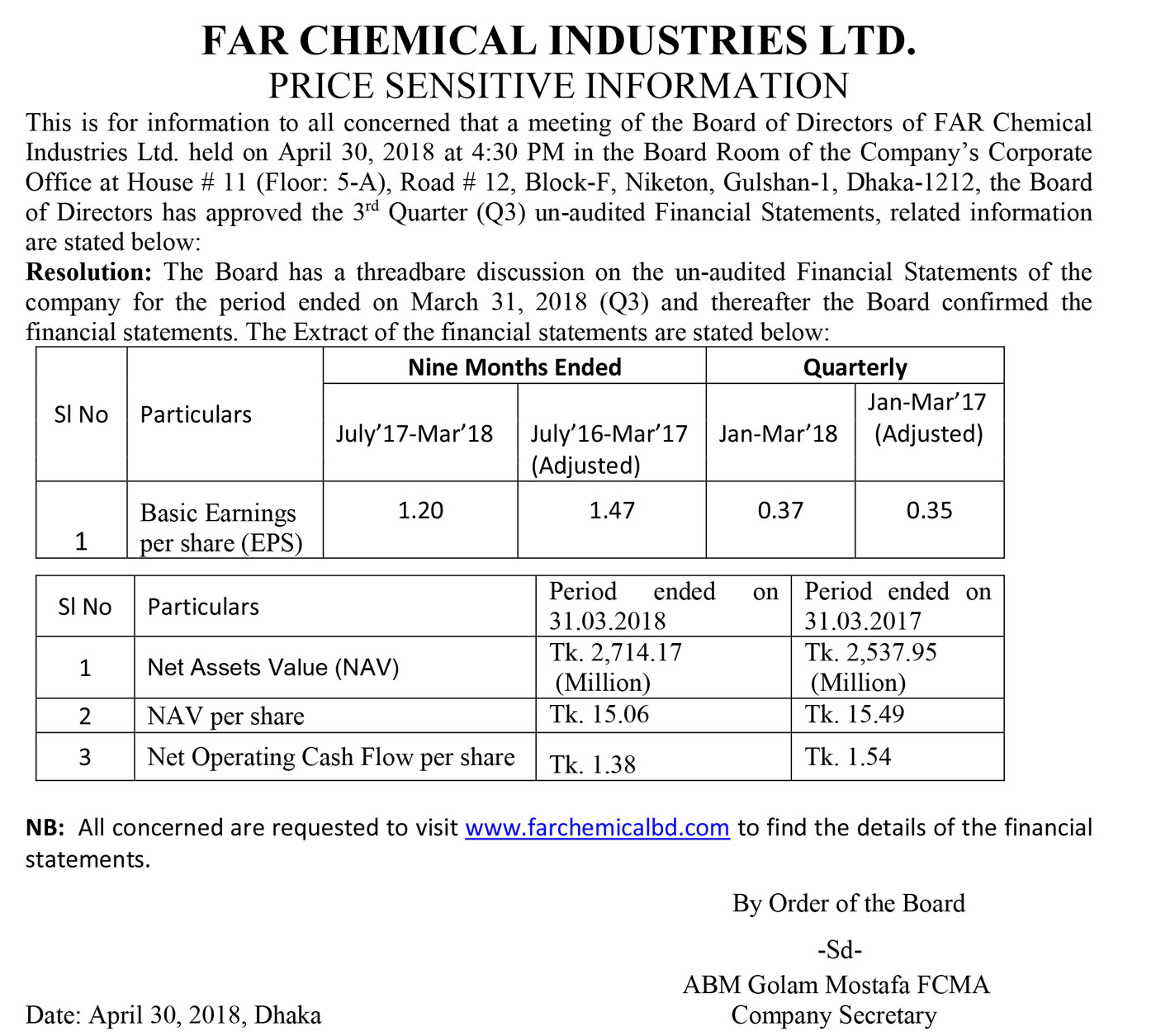 Price Sensitive Information of FAR Chemical & Textile Ind. PLC