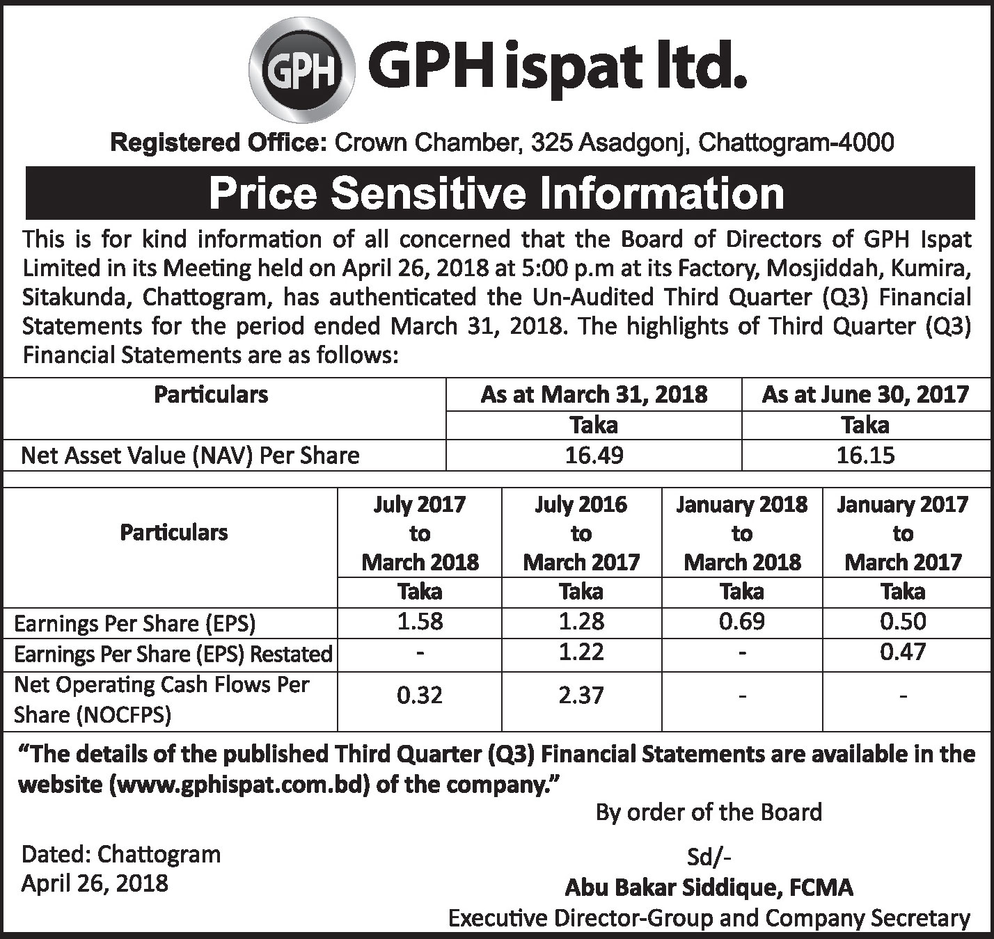 Q3 Financial Statements (Un-audited) of GPH Ispat Ltd