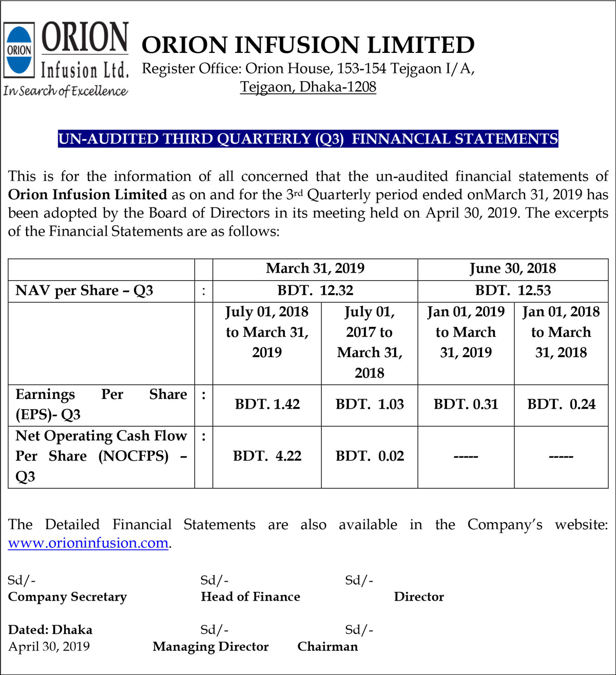Q3 Un-audited Financial Statements of Orion Infusion Ltd