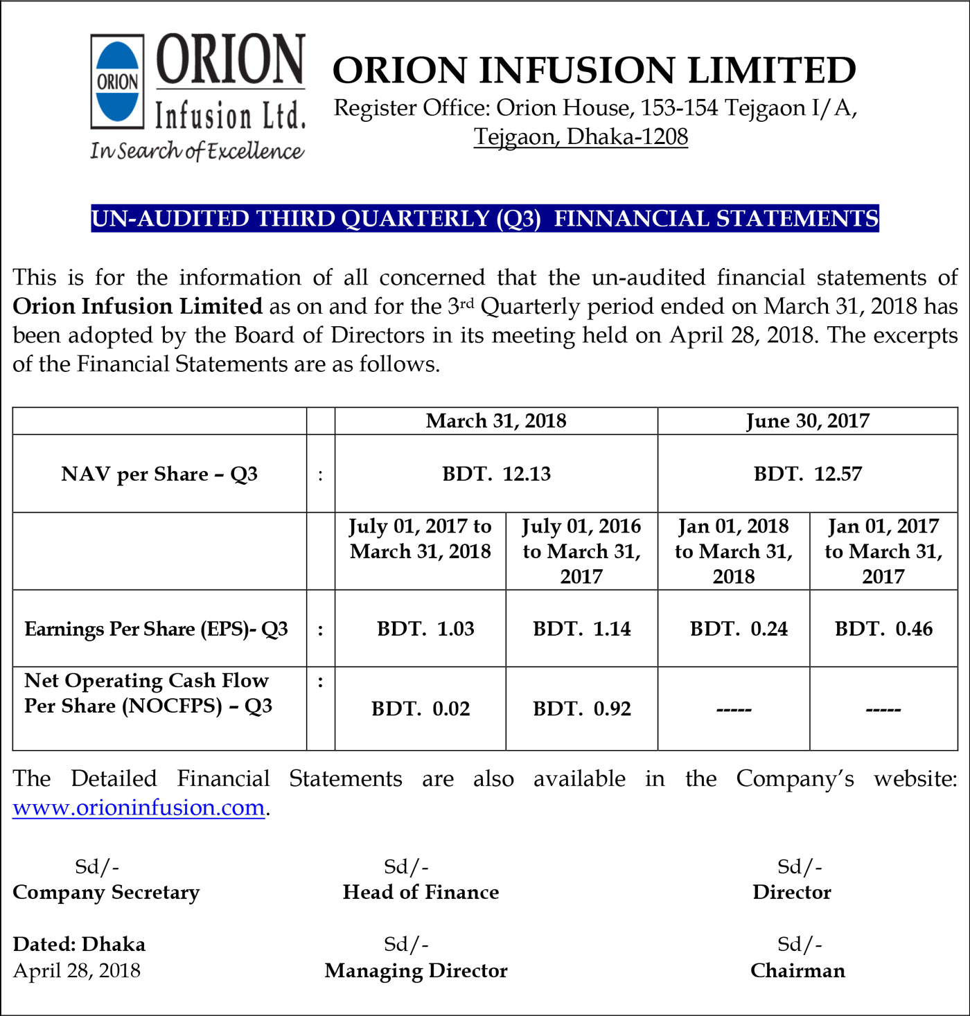 Q3 Un-audited Financial Statements of Orion Infusion Ltd