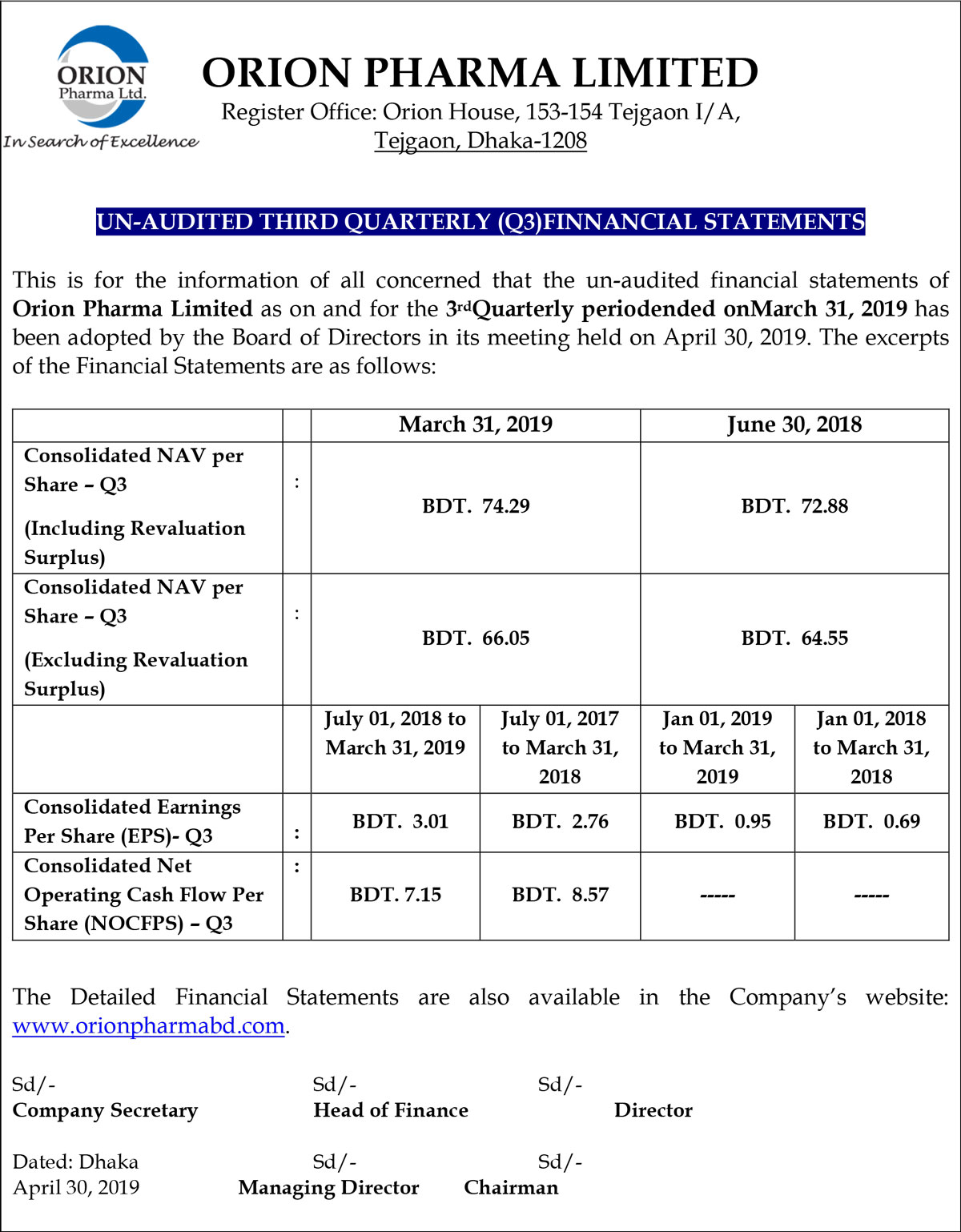 Un-audited Q3 Financial Statements of Orion Pharma Ltd