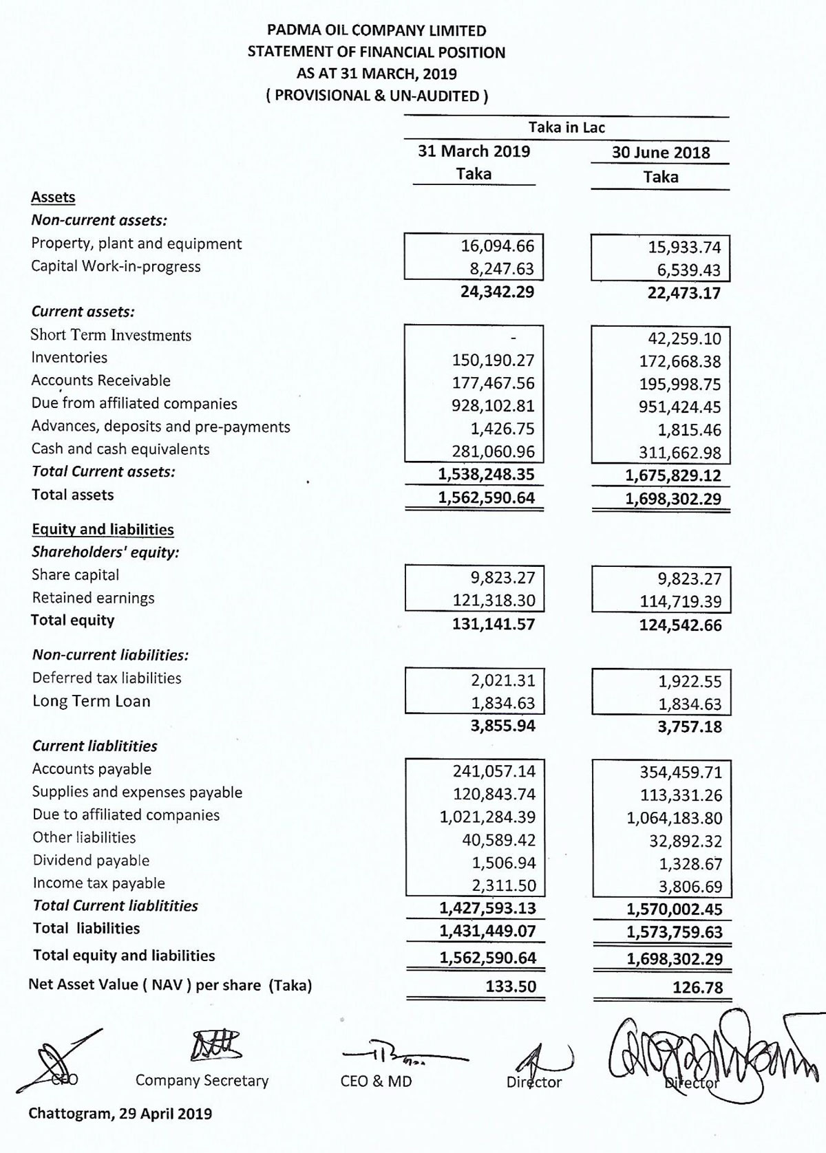 Statement of Financial Position (Provisional & Un-audited) of Padma Oil Company Ltd.