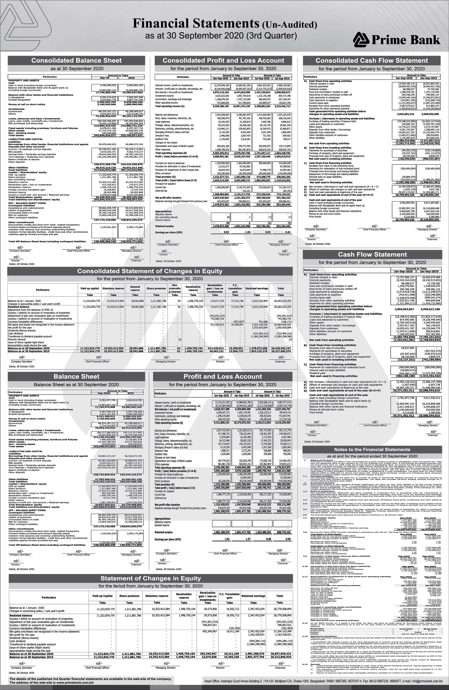 Q3 Financial Statements (Un-audited) of Prime Bank Limited