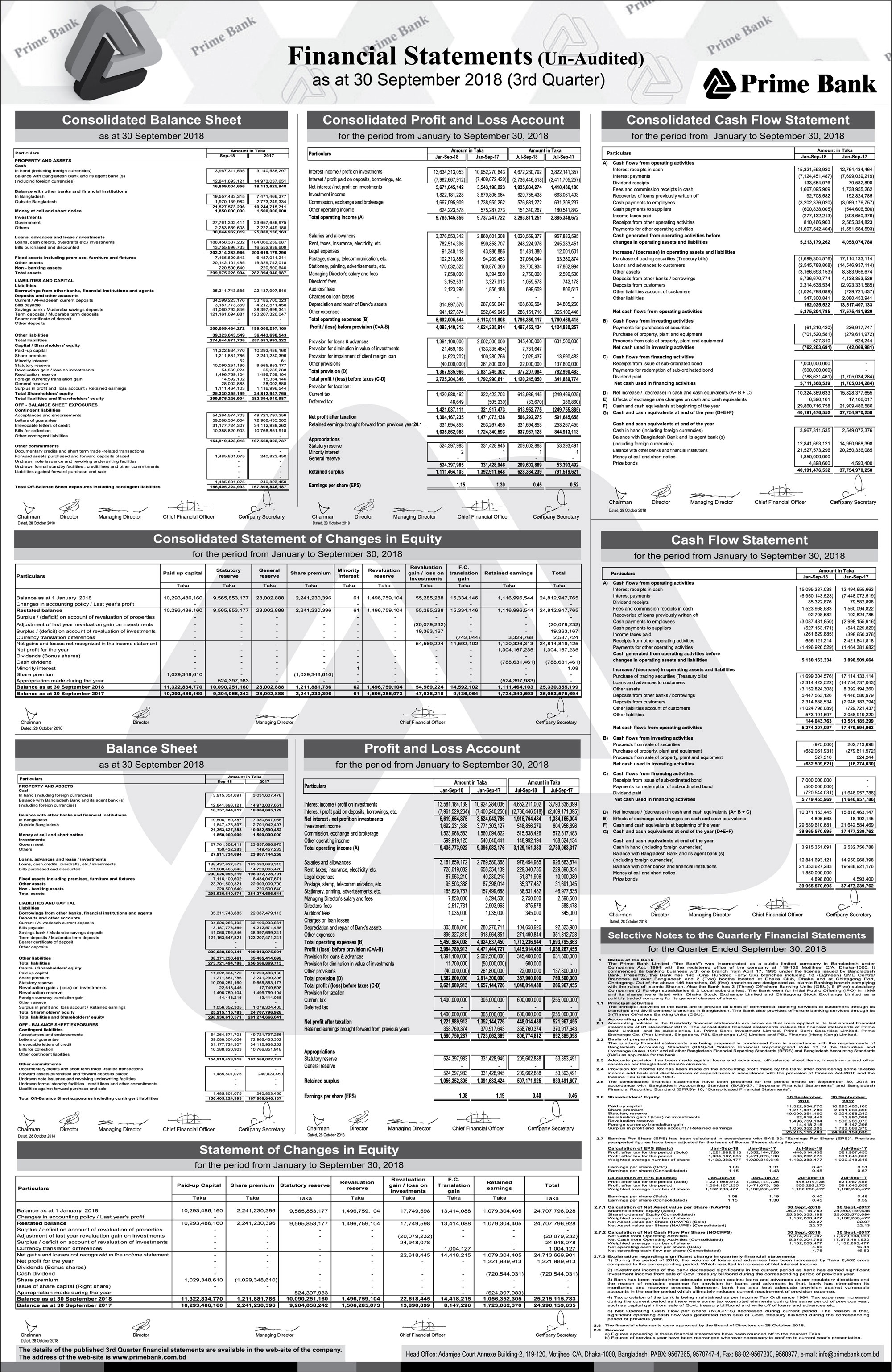 Half Yearly Un-audited Financial Statements of Prime Bank