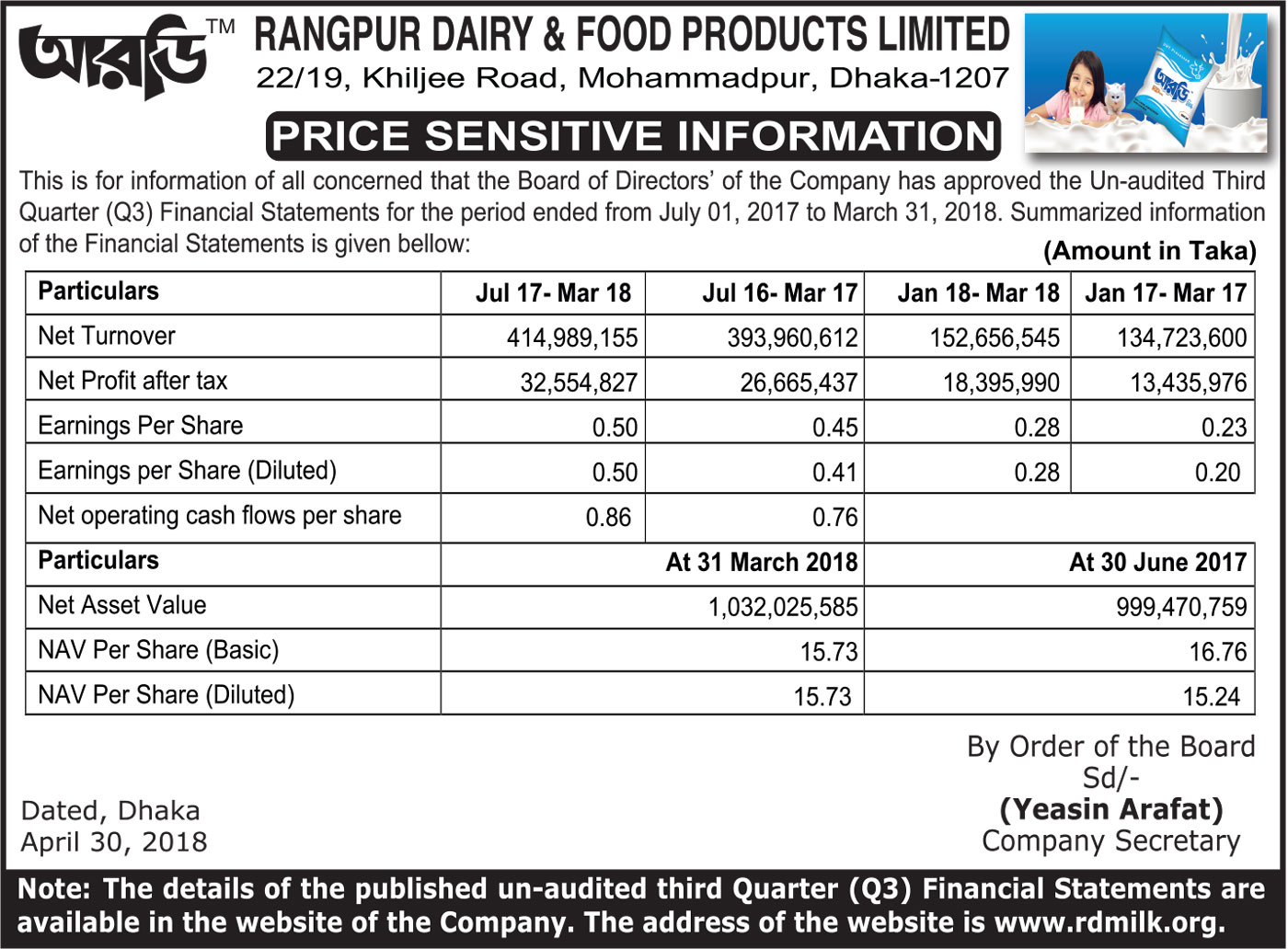 Rangpur Dairy & Food Products Limited Price Sensitive Information