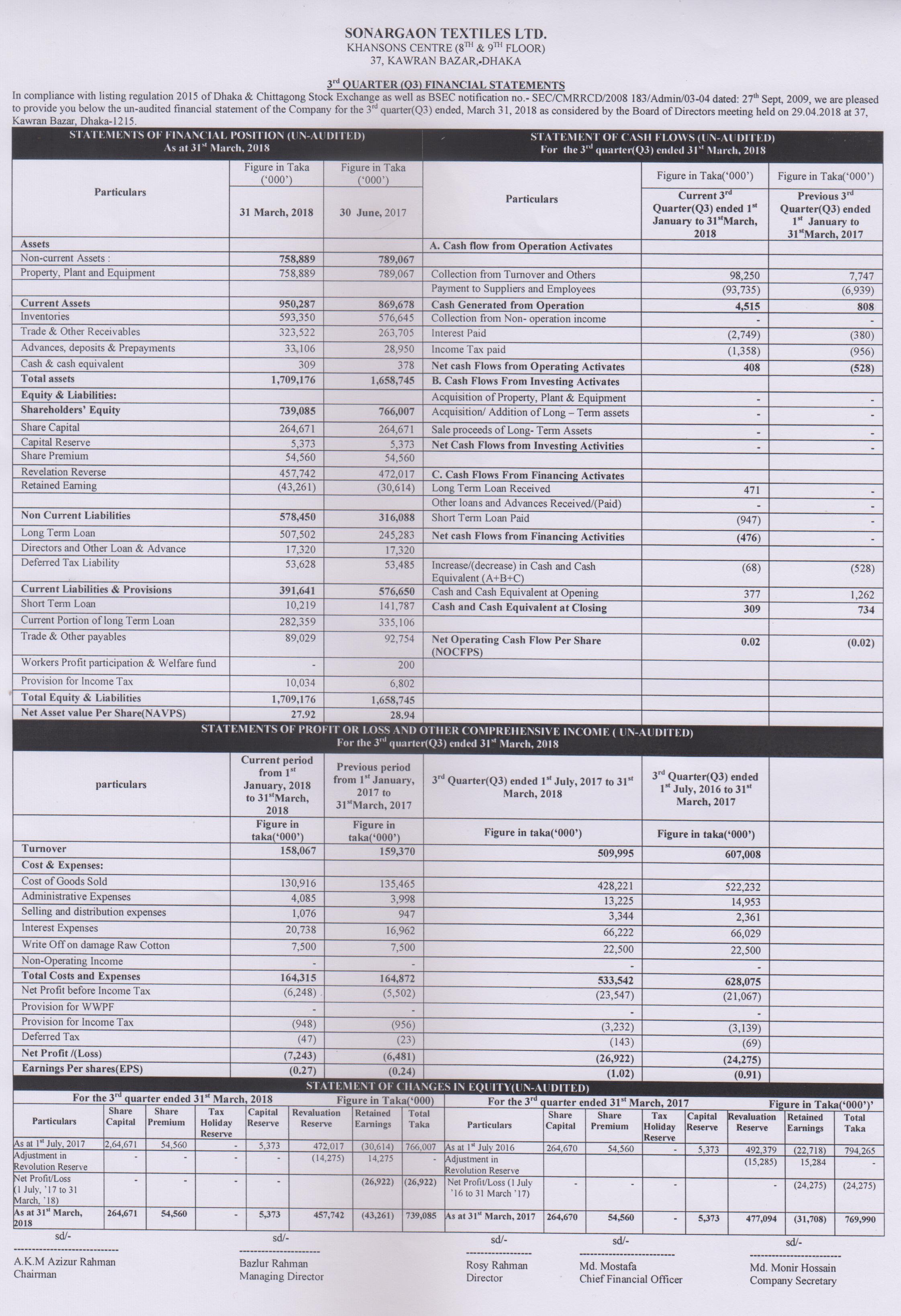 Q1 Financial Statements (Un-audited) of Sonargaon Textiles Ltd.