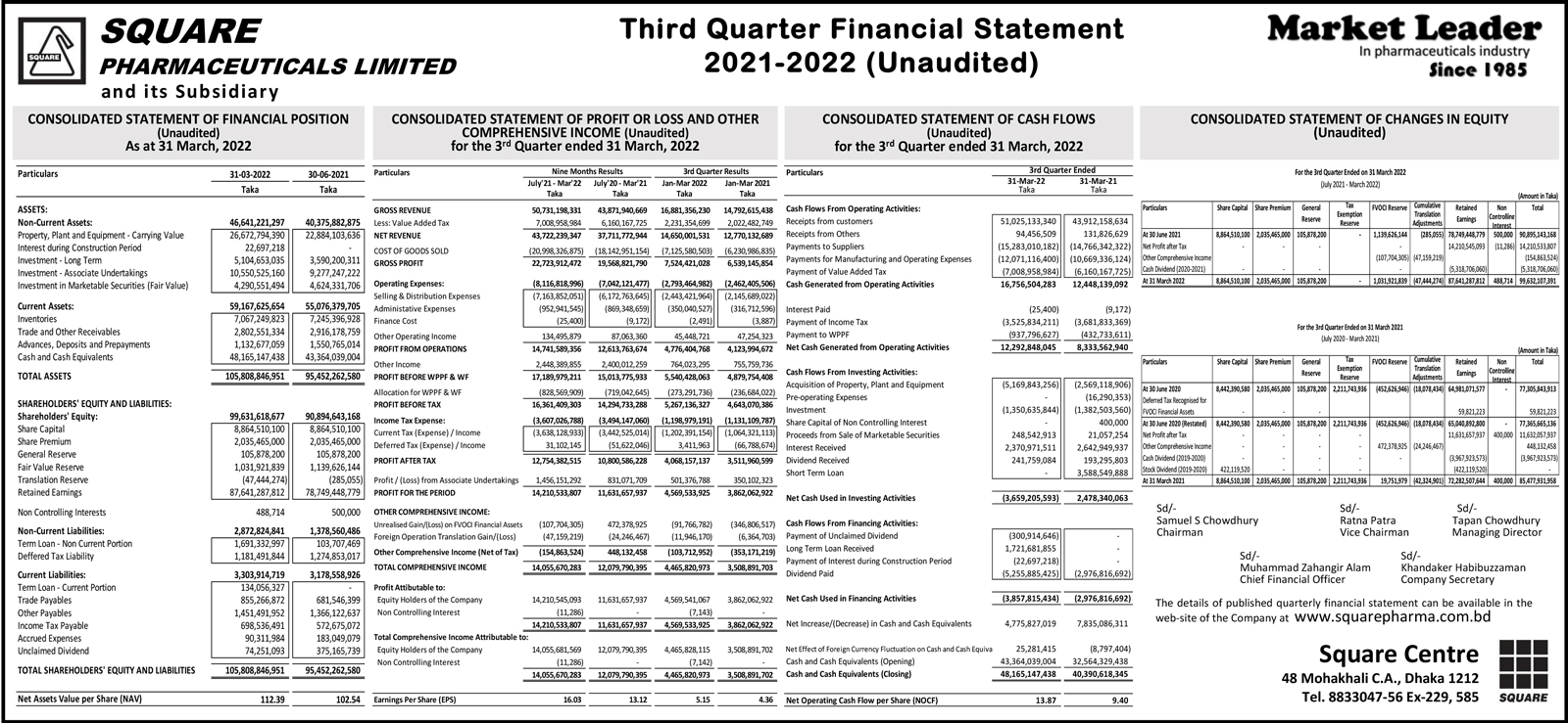 Q3 Financial Statements (Unaudited) of Square Pharmaceuticals Ltd