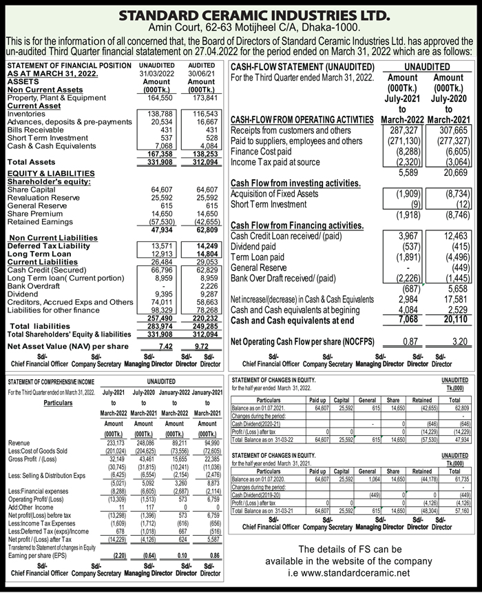 Q1 Un-audited Financial Statements of Standard Ceramic Industries Ltd