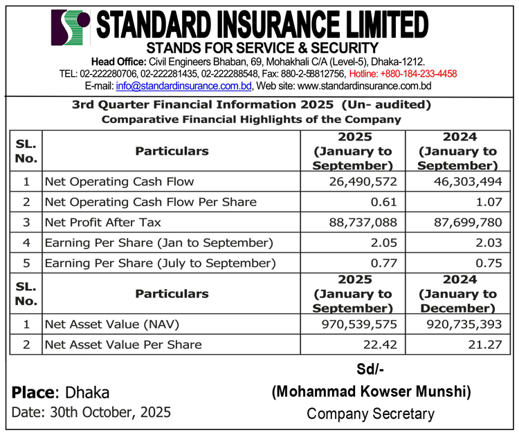 Q3 Financial Statements (Un-audited) of Standard Insurance Limited