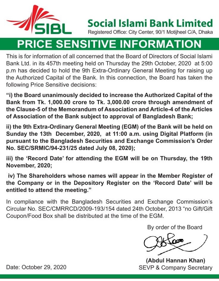 Notice of the 30th AGM of Social Islami Bank PLC.
