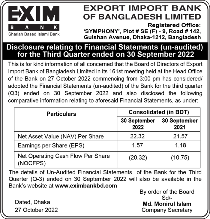 Q3 Un-audited Financial Statements of EXIM Bank