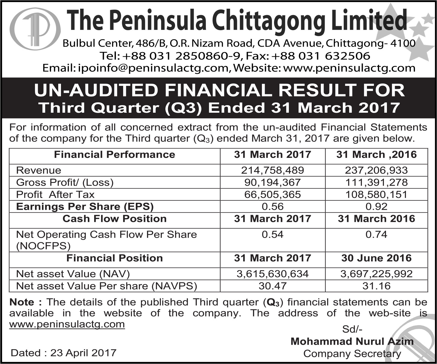 Un-Audited Financial Result Of The Peninsula Chittagong Limited