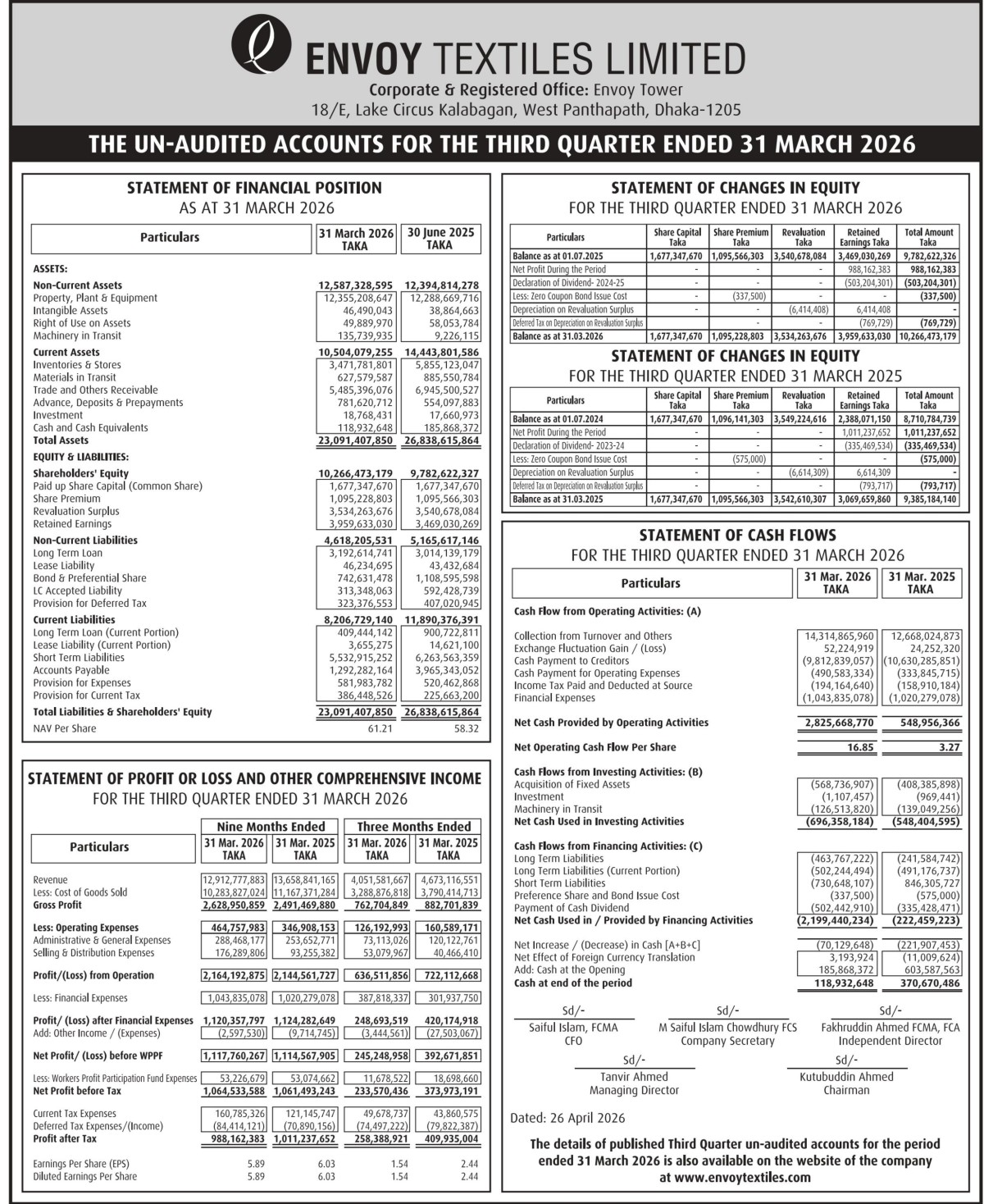 Q3 Un-audited Financial Statement of Envoy Textiles Limited