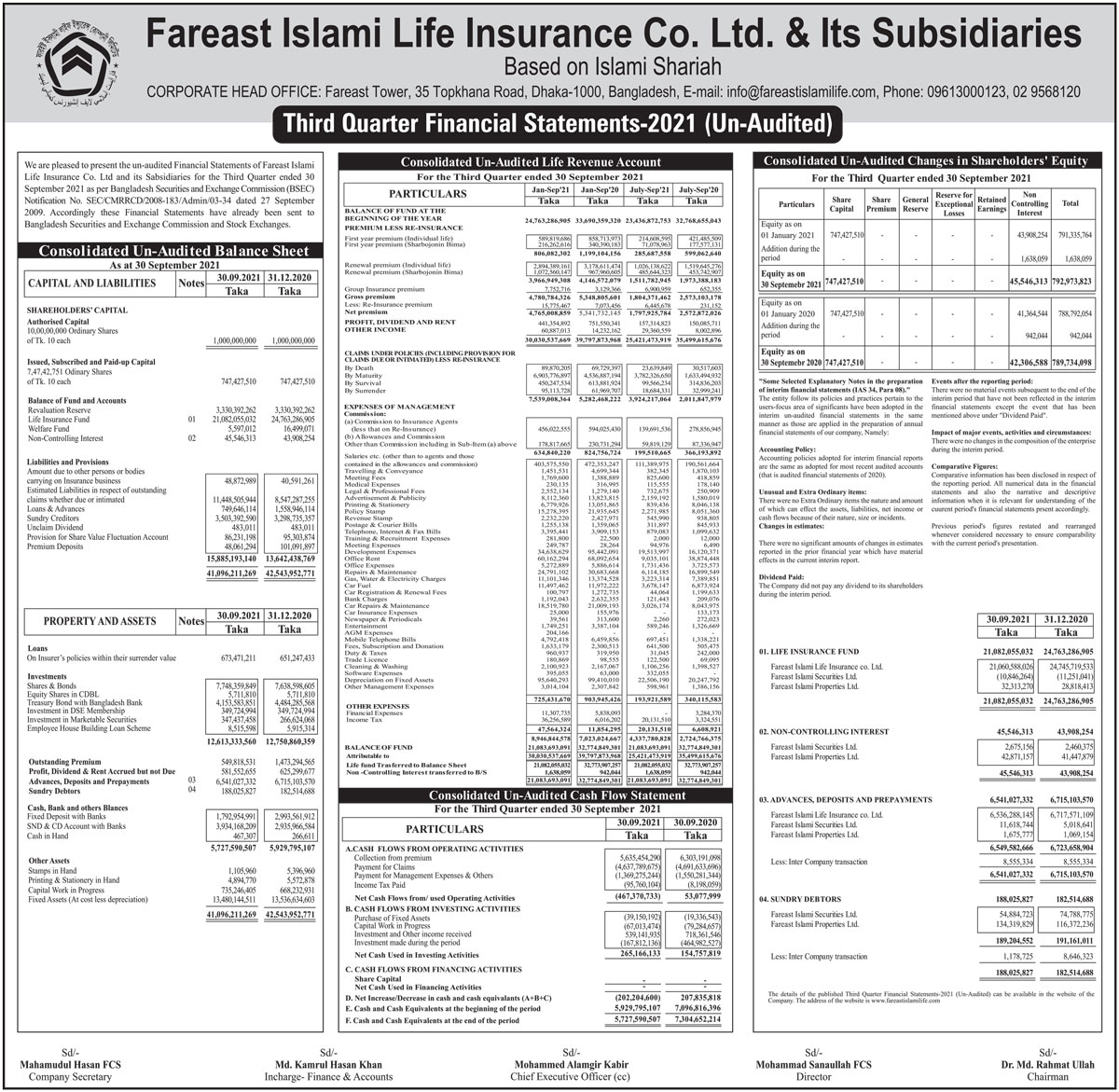 Q3 Financial Statements of Fareast Islami Life Insurance Co. Ltd & Its Subsidiaries