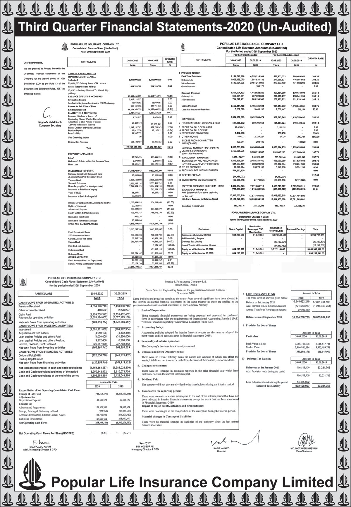 Q3 (Un-audited) Financial Statements of Popular Life Insurance Co. Ltd