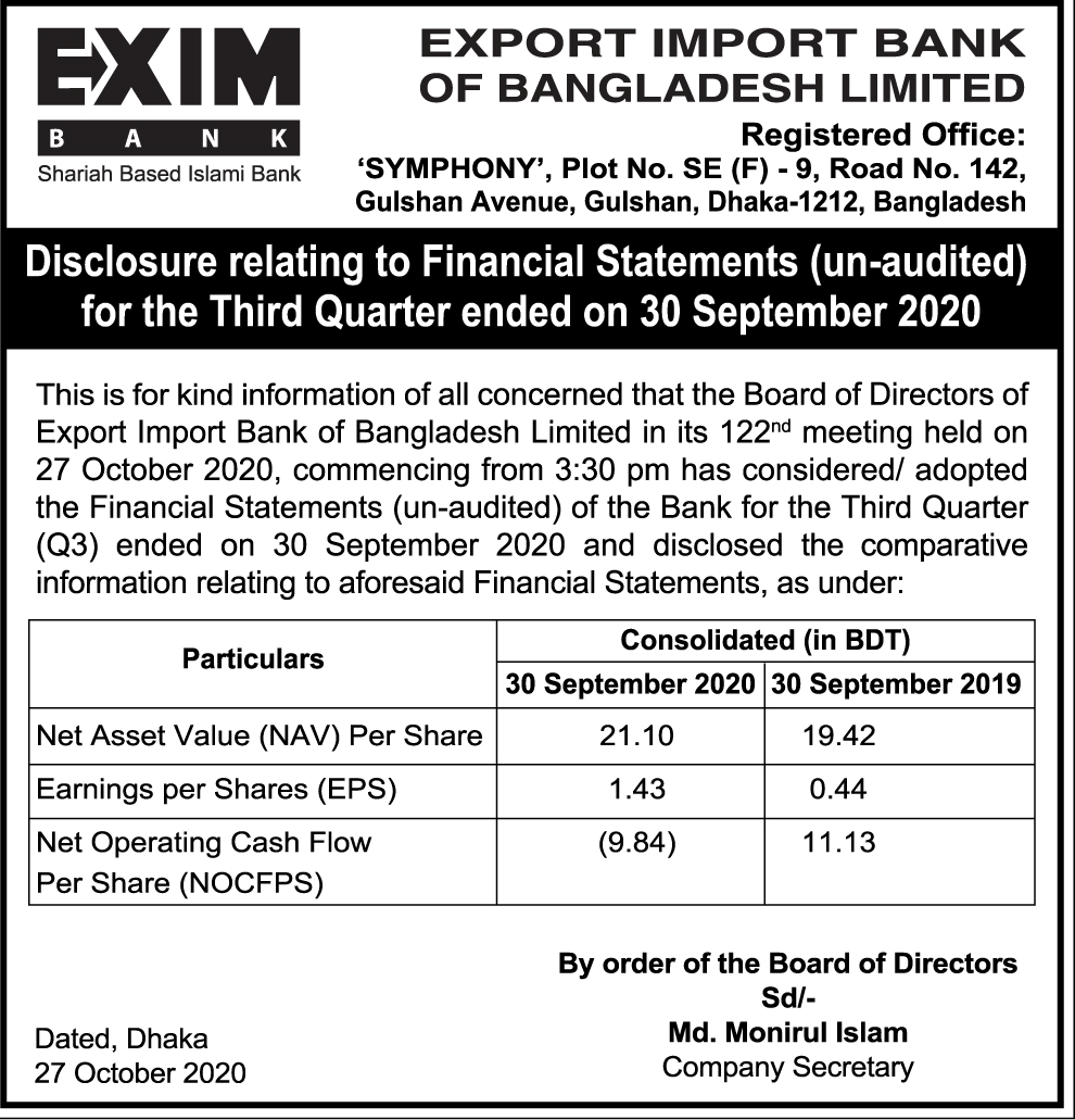 Q3 (Un-audited) Financial Statements of EXIM Bank Limited