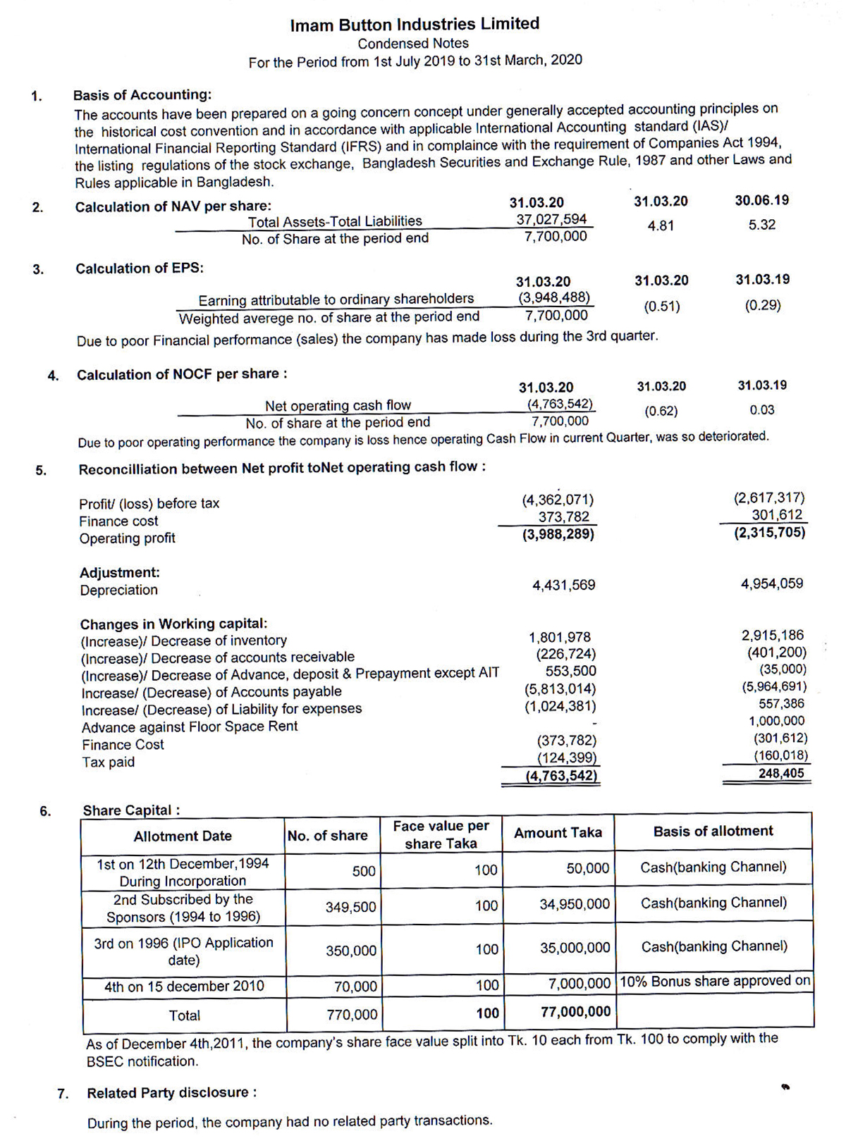 Q2 Financial Statements (Un-audited) of Imam Button Industries Ltd.