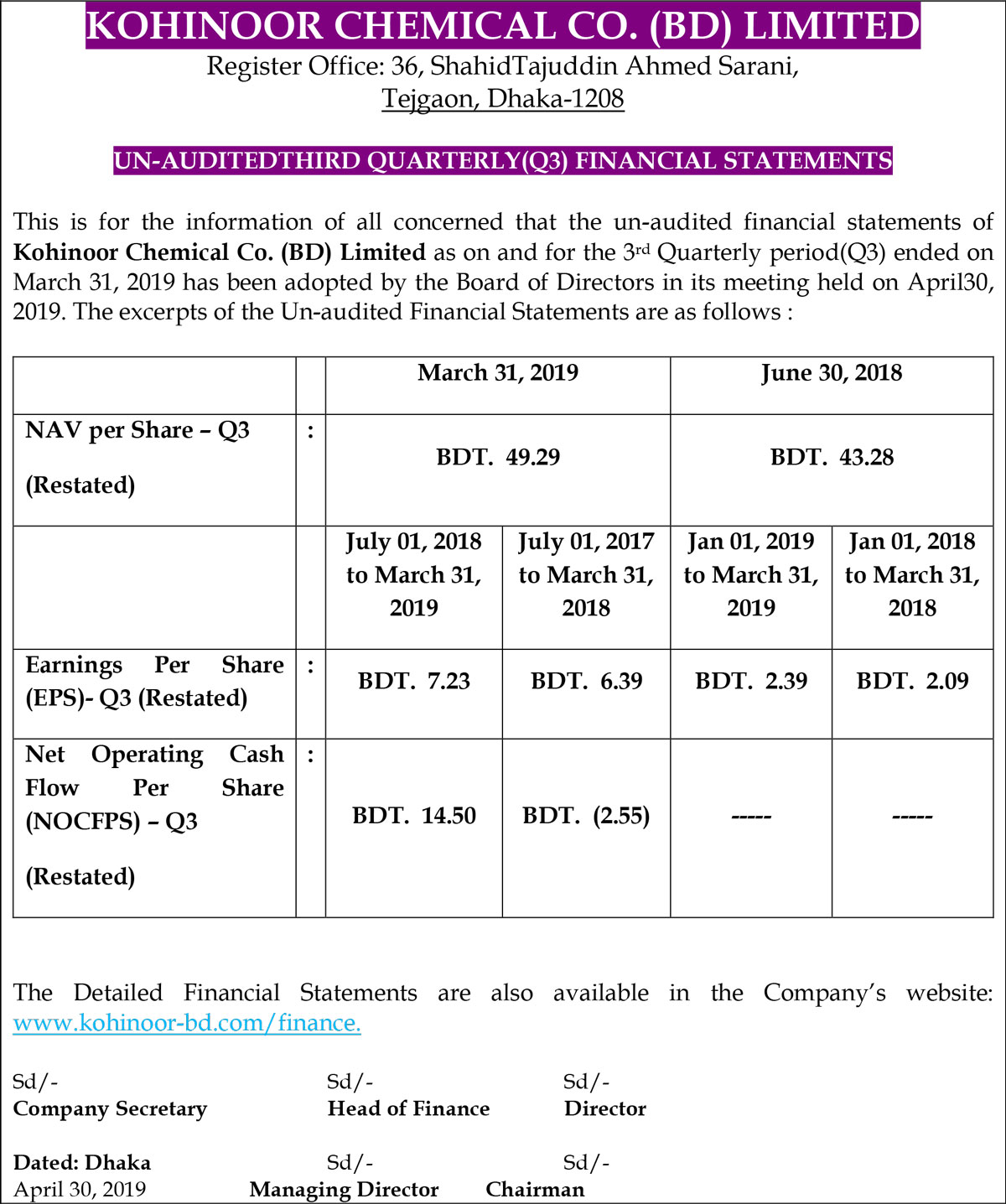 Q3 Un-audited Financial Statements of Kohinoor Chemical Co. (BD) Limited