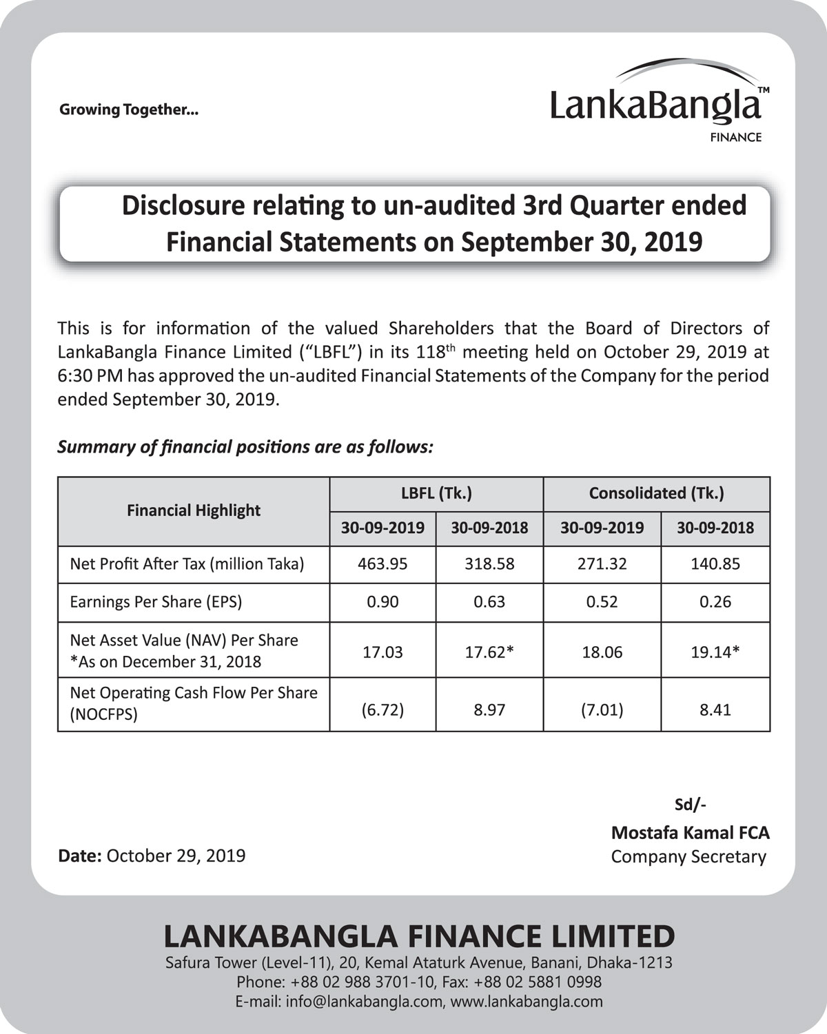 Q3 Un-audited Financial Statements of LankaBangla Finance ltd