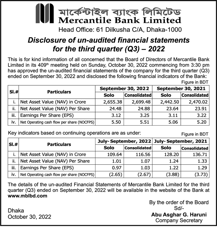 Q3 (Un-audited) Financial Statements of Mercantile Bank Limited.
