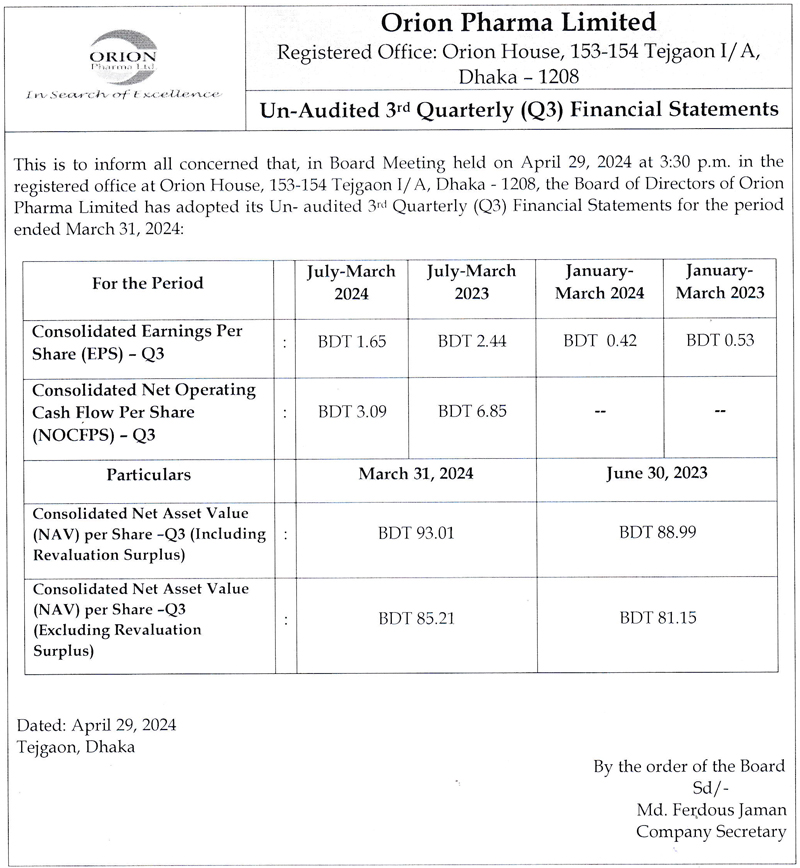 Q3 Un-audited Financial Statements of Orion Pharma Ltd