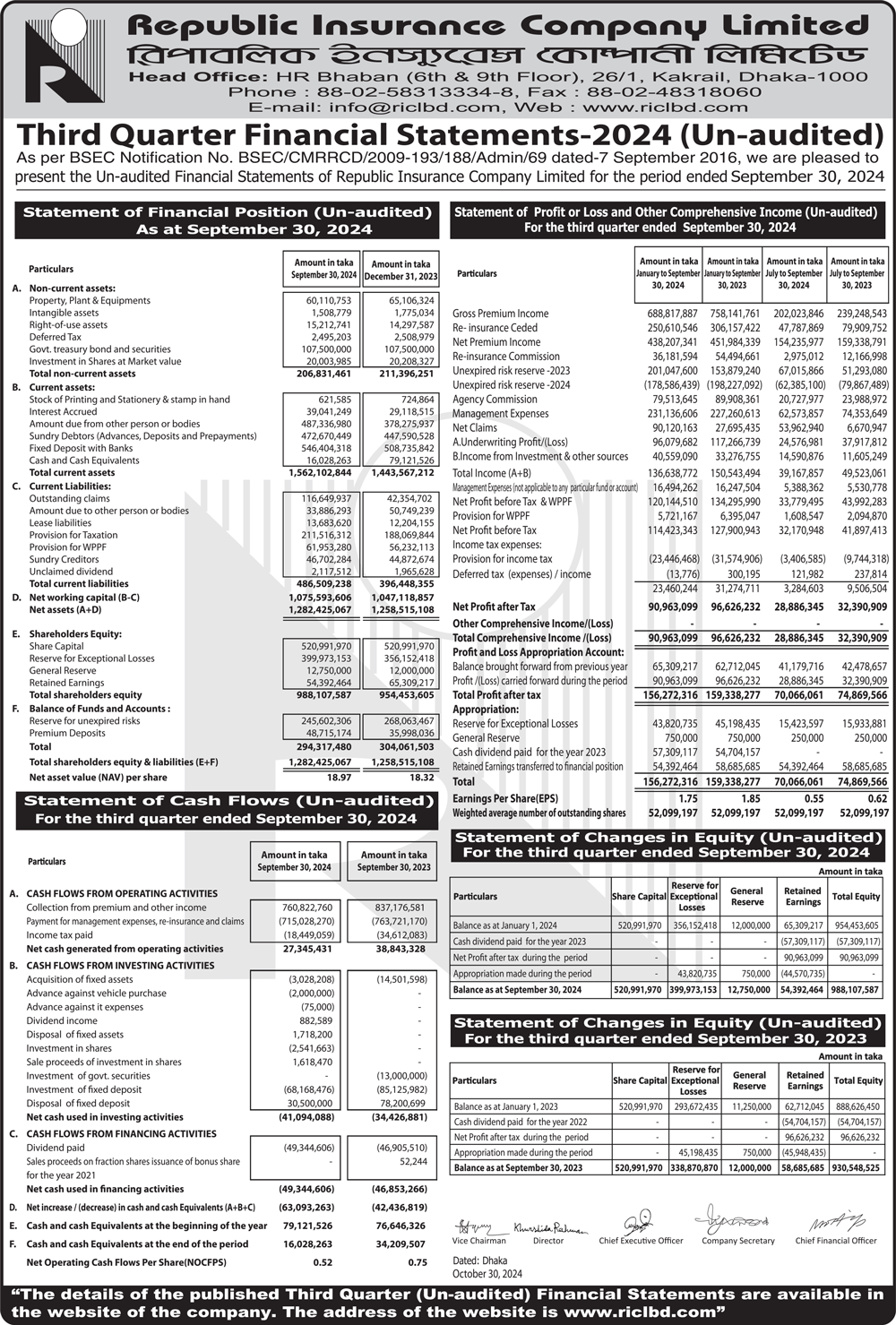 Q3 Un-audited Financial Statements of Republic Insurance Company Limited