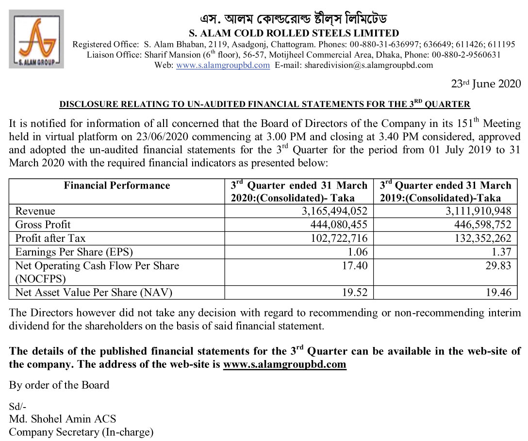 Q3 Un-audited Financial Statements of S. Alam Cold Rolled Steels Ltd