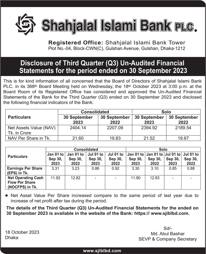 Q3 Un-audited Financial Statements of Shahjalal Islami Bank Limited
